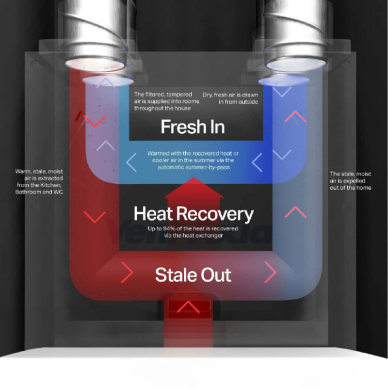 Here’s how it works: Imagine the air in the home as a continuous flow. The MVHR system is designed to extract stale, moist air from rooms like the bathroom and kitchen, where humidity and pollutants tend to build up. This air is then passed through a heat exchanger, which cleverly recovers up to 80% of the heat from the outgoing air.